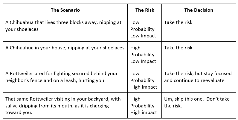 Risk assessment matrix: Identify the scenario where you may do something. Identify the probability that you will be exposed for doing and the negative impact of any response and make the right decision on whether to do from the matrix. Oh, look, I made one for you. You want to do something and move into a neighborhood with dogs.