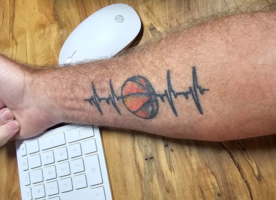 When he turned 18, I asked if he wanted to get tattoos together. He was afraid of the needle and possible pain. I would bring it up to him from time to time, but always the same response. So, I was both surprised and delighted when his 38th birthday was near, and he told me that he wanted to get basketball tattoos together. We agreed that they did not have to be the same as each other, as long as both had a basketball theme. When the day came, he got a massive arm sleeve of a slam dunk in action. I was a bit stunned that his very first tattoo was so large, but I was equally impressed. I opted for a basketball on my forearm with an EKG heartbeat running through it. Because when we started playing basketball, I could feel my heart beating for him.