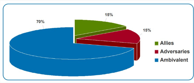 - Address Ambivalence. In any environment, there are Allies, Adversaries and Ambivalent. Typically, the Allies and Adversaries make up a mere 15% each. The Ambivalent are often a daunting majority. The Allies already agree with you. The Adversaries may not ever agree with you. But the Ambivalent are malleable. That’s the target audience, regardless of size. The population of the United States is about 330 million. The number who are eligible to vote is around 240 million. The number who actually voted is about 145 million. The remaining 90 million people – they are the ambivalent. This group is not much larger than the Allies and Adversaries (at 70+ million each), and yet it is still so large it can seem intimidating. Fortunately, we would only need to sway five percent to change outcomes. They are the ones we need to reach and have a conversation.