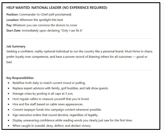 Here is my final proof of MAGA’s suspension of disbelief. If they truly wanted what we now have, long before Trump came on the scene, they would have been asking for all of the things that this Want Ad seeks. They have to suspend disbelief and pretend that they want this. Because they now have this and are not complaining.